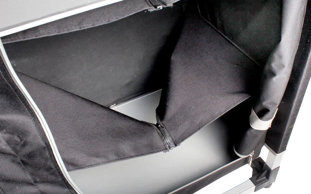 - Mikrometrischer Niveauausgleich mit Wasserwaage • Obere Ablageplatte aus MDF • Strapazierfähiger Polyesterbezug • Belüftungsgaze in der Rückwand • Inklusive Tragetasche