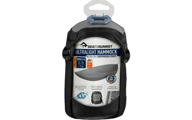 Die ultraleichten Hängematten verfügen über ein speziell entwickeltes 20D Nylon Monofilment Gewebe. Es schwebt förmlich mit seinen 140 Gramm und kann bis zu 135 kg tragen. Aufgrund dieses Monofilment Materials kann man sie extrem klein verpacken. Die ultraleichten Schnallen aus Aluminium 6061 sind mit den Hängematten per 0,8 mm dehnungsfreiem Dyneema-Gurtband aus Polyester-Mischgewebe verbunden, das an jedem Ende fünfmal mit Riegelnähten versehen ist, um höchste Sicherheit zu gewährleisten. Federleicht, trotzdem beeindruckende Festigkeit und ein winziges Packmaß.